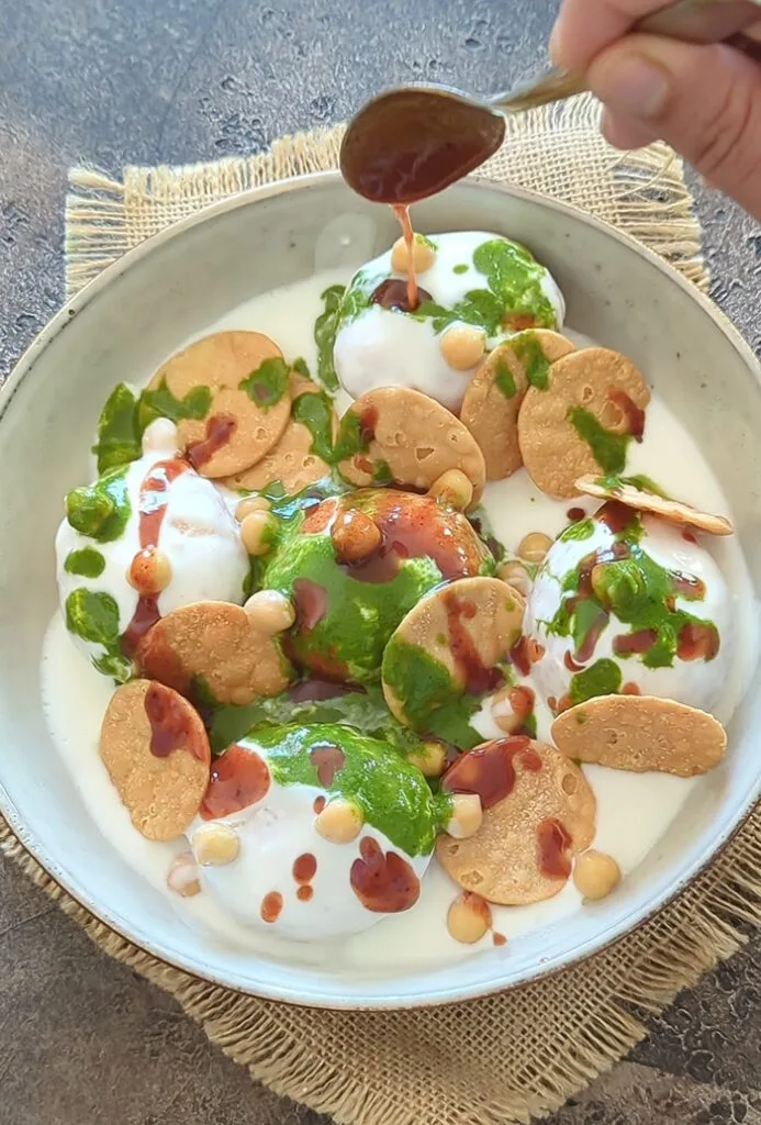 Soft, fluffy bhallas (lentil vadas) are soaked till spongy and topped with crispy papdi, chilled sweetened yogurt (dahi), tamarind chutney, green chutney, and mild spices.
