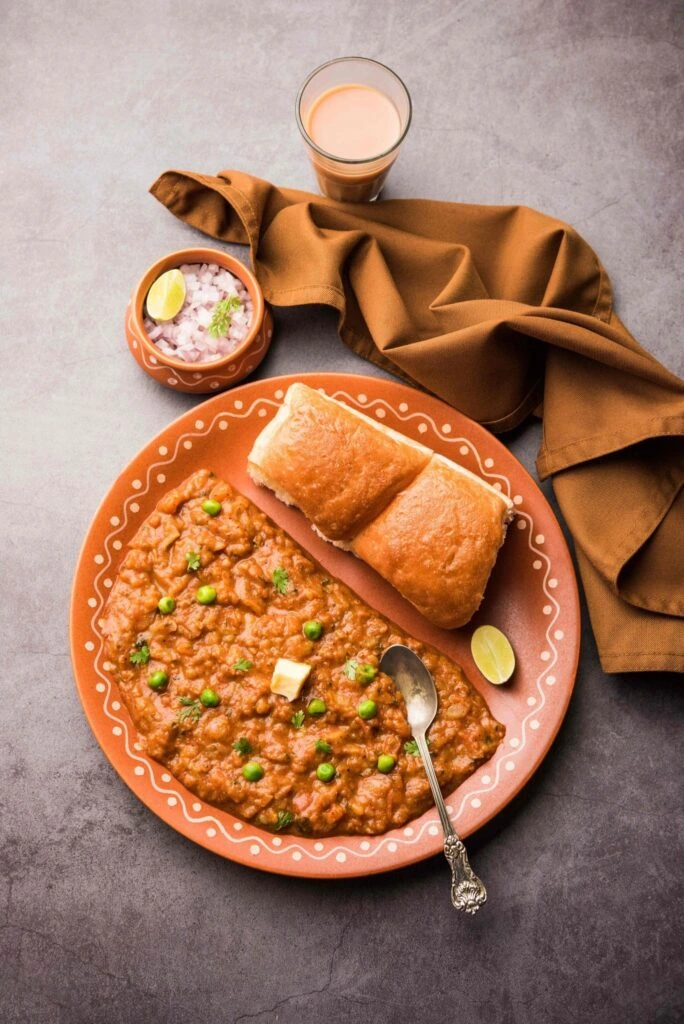 Pav Bhaji is a popular Indian fast food dish consisting of a spicy, mashed vegetable curry served with buttered bread rolls.