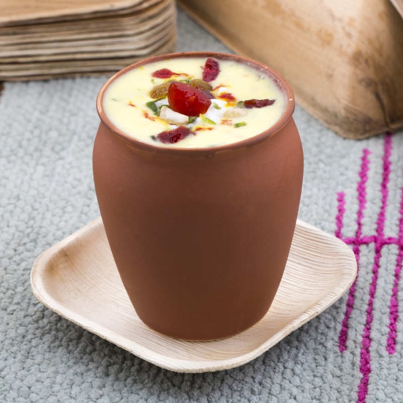 Thick, creamy Indian drink made by blending ripe mango pulp with fresh yogurt, a little sugar, and sometimes a hint of cardamom.